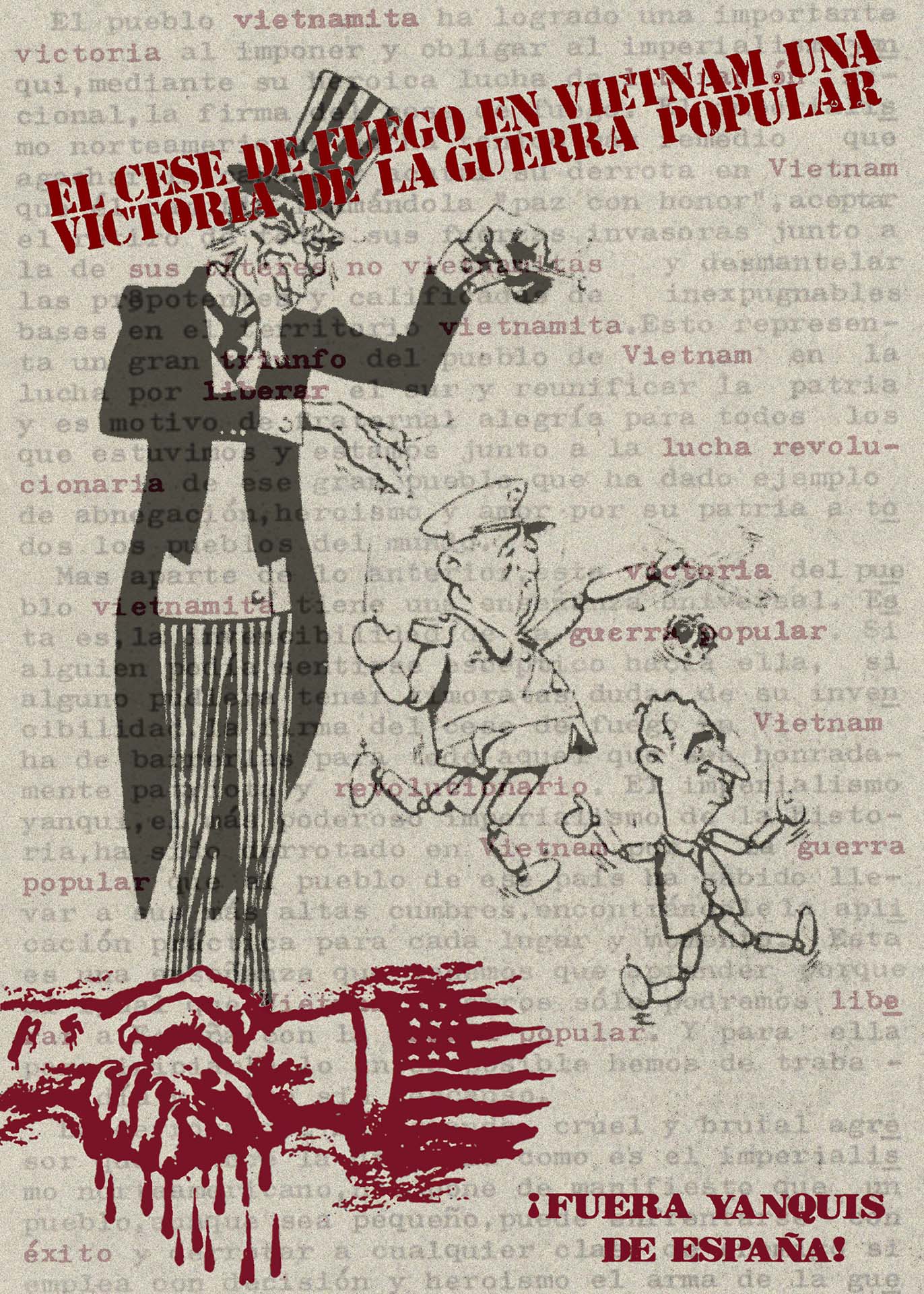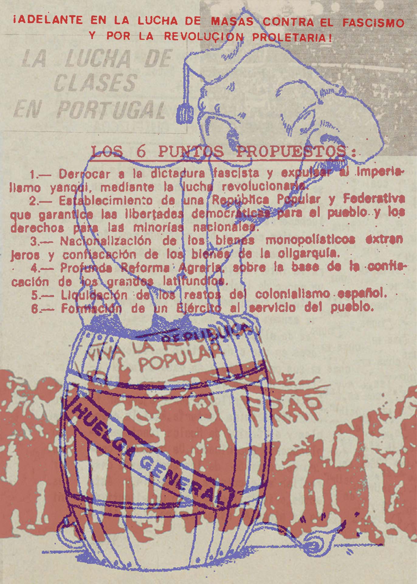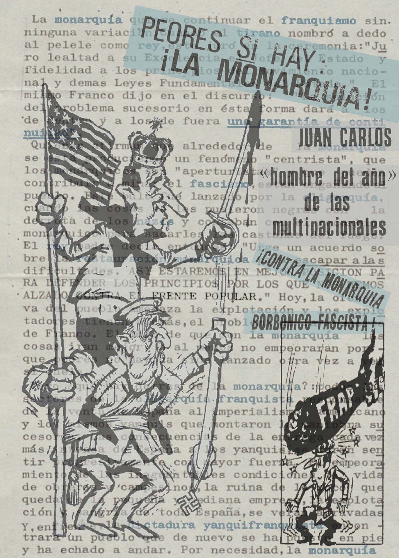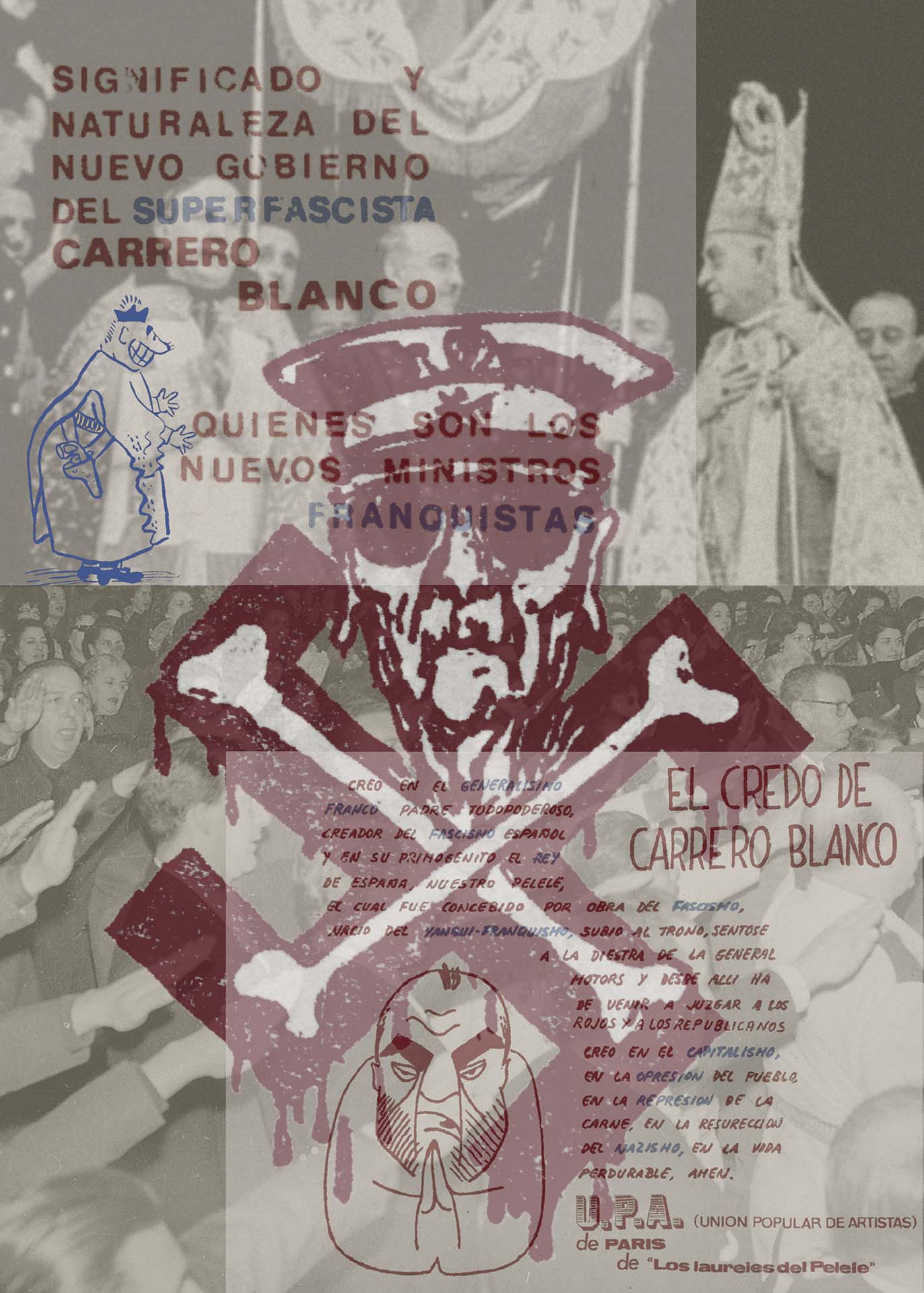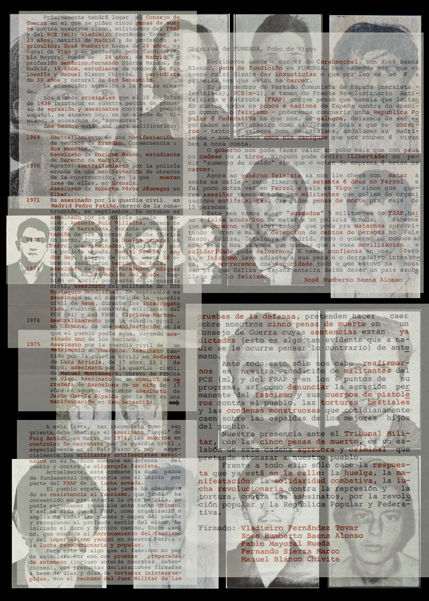 Los fotomontajes están realizados con imágenes y textos extraídos de publicaciones de los años 70 como ¡Acción! Frente Revolucionario Antifascista y Patriota, Frente Libertario. Confederación Nacional del Trabajo, Mundo Obrero. Órgano del Comité Central del Partido Comunista de España, Vanguardia Obrera. Órgano del Comité Central del Partido Comunista de España (M-L), Línea Proletaria. Órgano del Comité Central del Partido Comunista de España (internacional), Servir al Pueblo. Órgano del Comité Central del Movimiento Comunista de España (M.C.E.), Combate. Órgano Central de LCR-ETA (VI), Le Combat Syndicaliste. Organe Officiel de la Confederation Nationale du Travail, Solidaritat, Diario de Barcelona, El Diario del Siglo XX, El Progreso. También con prensa, fotografías familiares y otra documentación facilitada por Flor Baena y Manuel Reinoso.